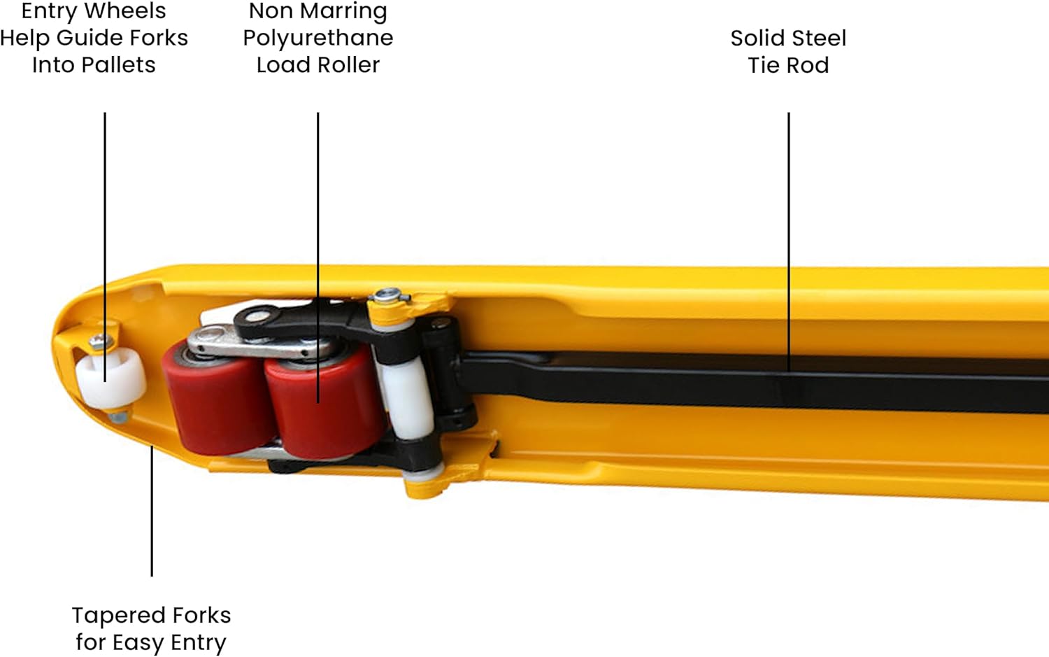 • Smooth Polyurethane Wheels: Equipped with 7" polyurethane steering wheels and 3" fork wheels for quiet rolling, reduced floor wear, and excellent maneuverability. Ideal for any floor and tight aisles needing a smooth-rolling pallet mover.