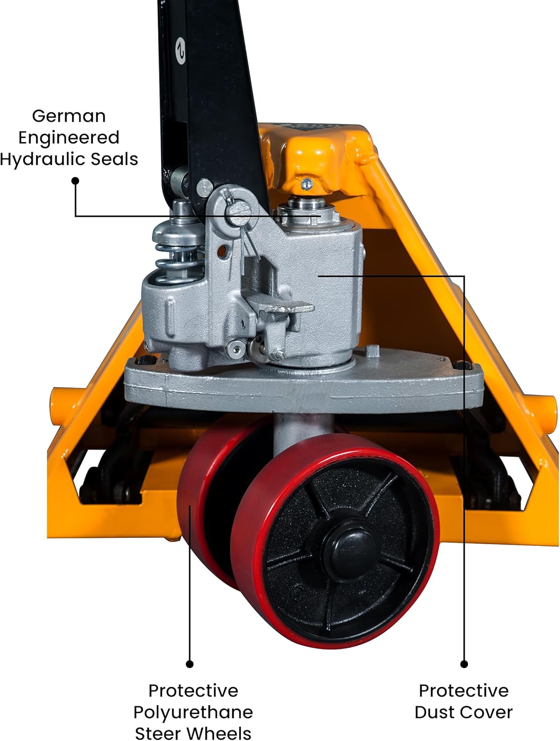 • Leak-Resistant Hydraulic Pump: Built with a durable, leak-resistant hydraulic system for long-lasting performance. Delivers consistent lift strength while reducing downtime, perfect for facilities needing a reliable hydraulic pallet jack.