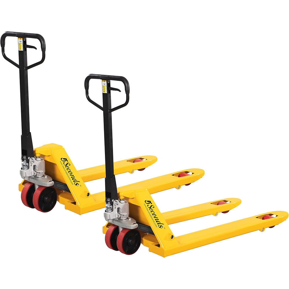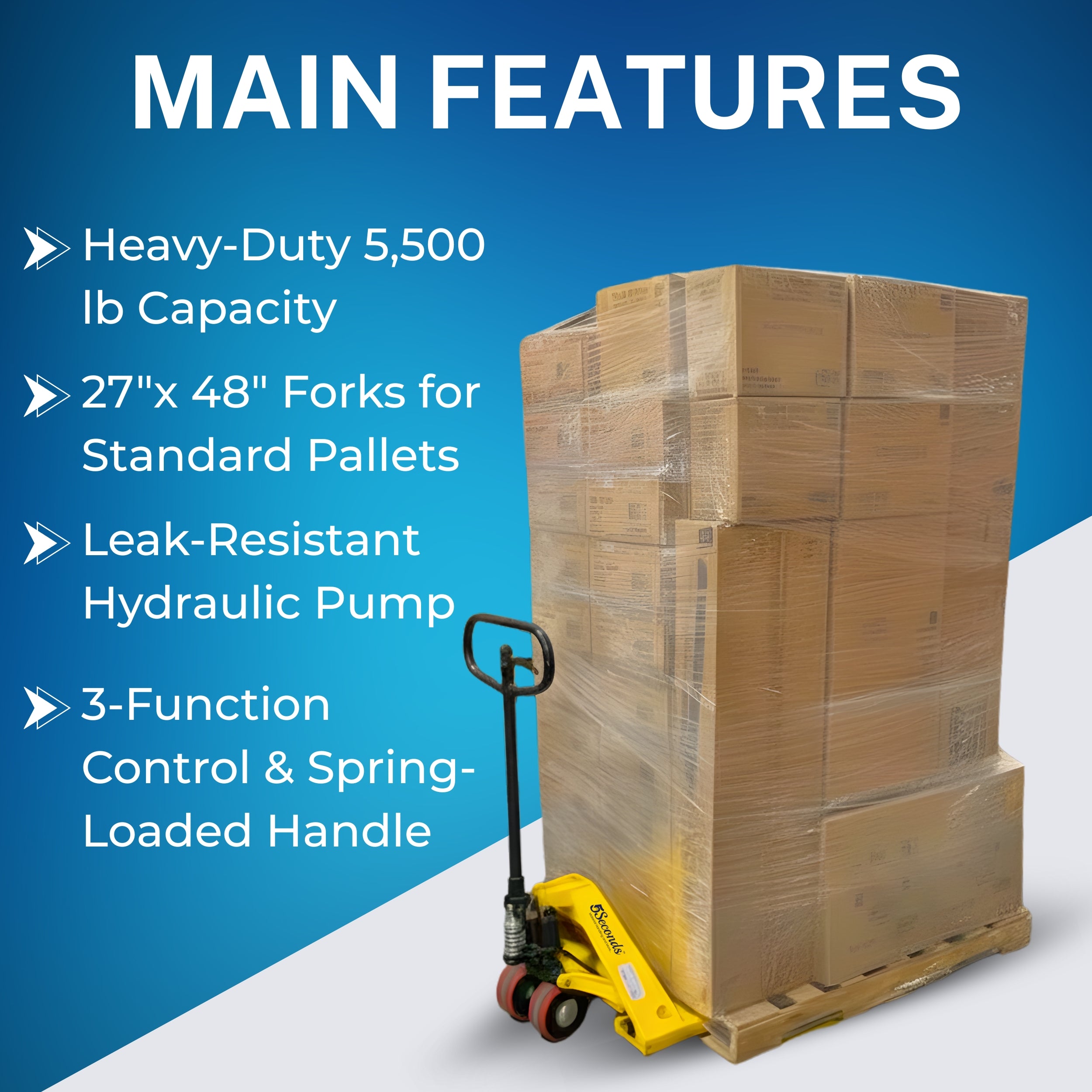 - Heavy-Duty 5,500 lb Capacity: This heavy duty pallet jack features a reinforced steel frame and fork stiffener, delivering powerful lifting performance for warehouses, factories, and shipping areas. Ideal manual pallet jack for moving heavy loads with confidence.