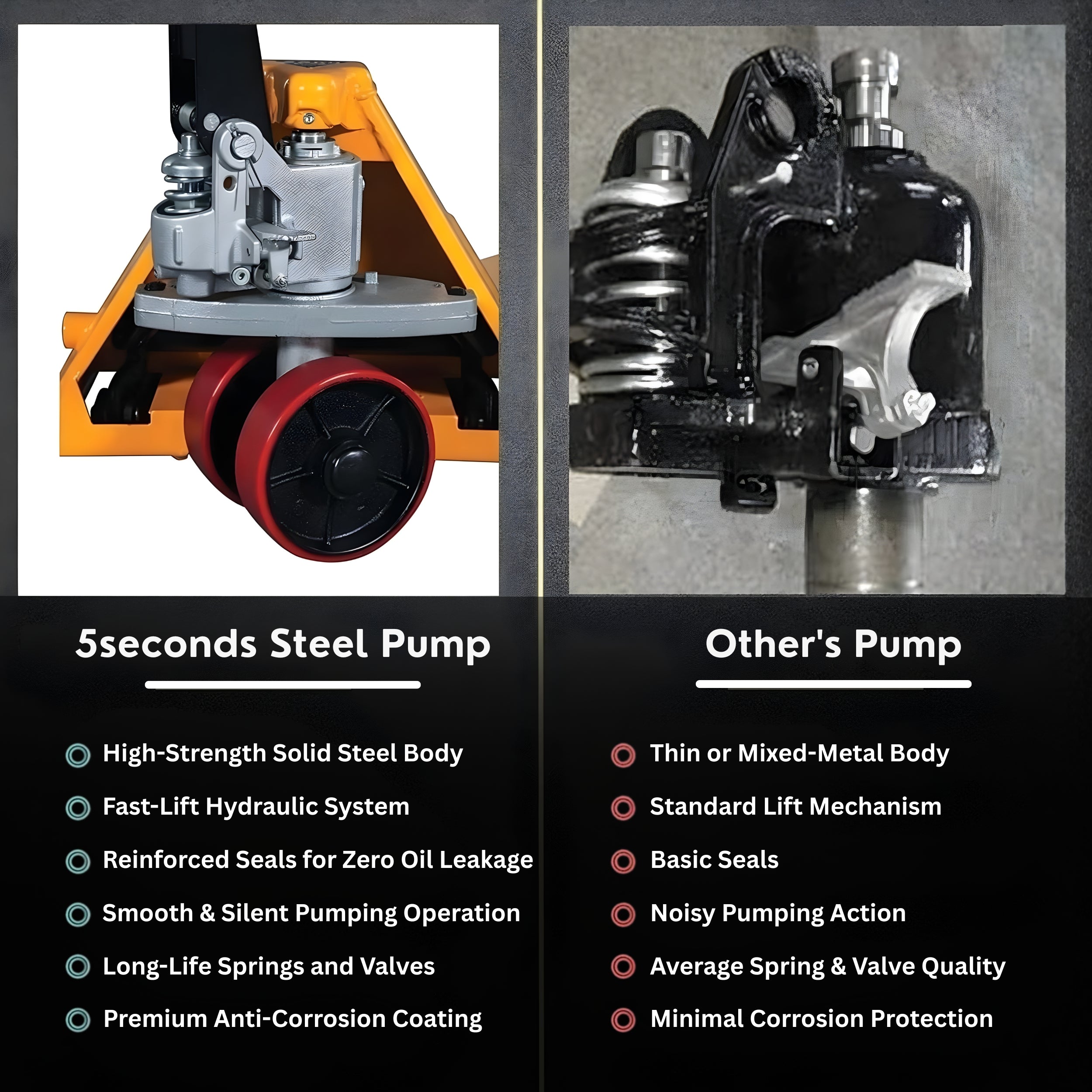 - Leak-Resistant Hydraulic Pump: Built with a durable, leak-resistant hydraulic system for long-lasting performance. Delivers consistent lift strength while reducing downtime, perfect for facilities needing a reliable hydraulic pallet jack.