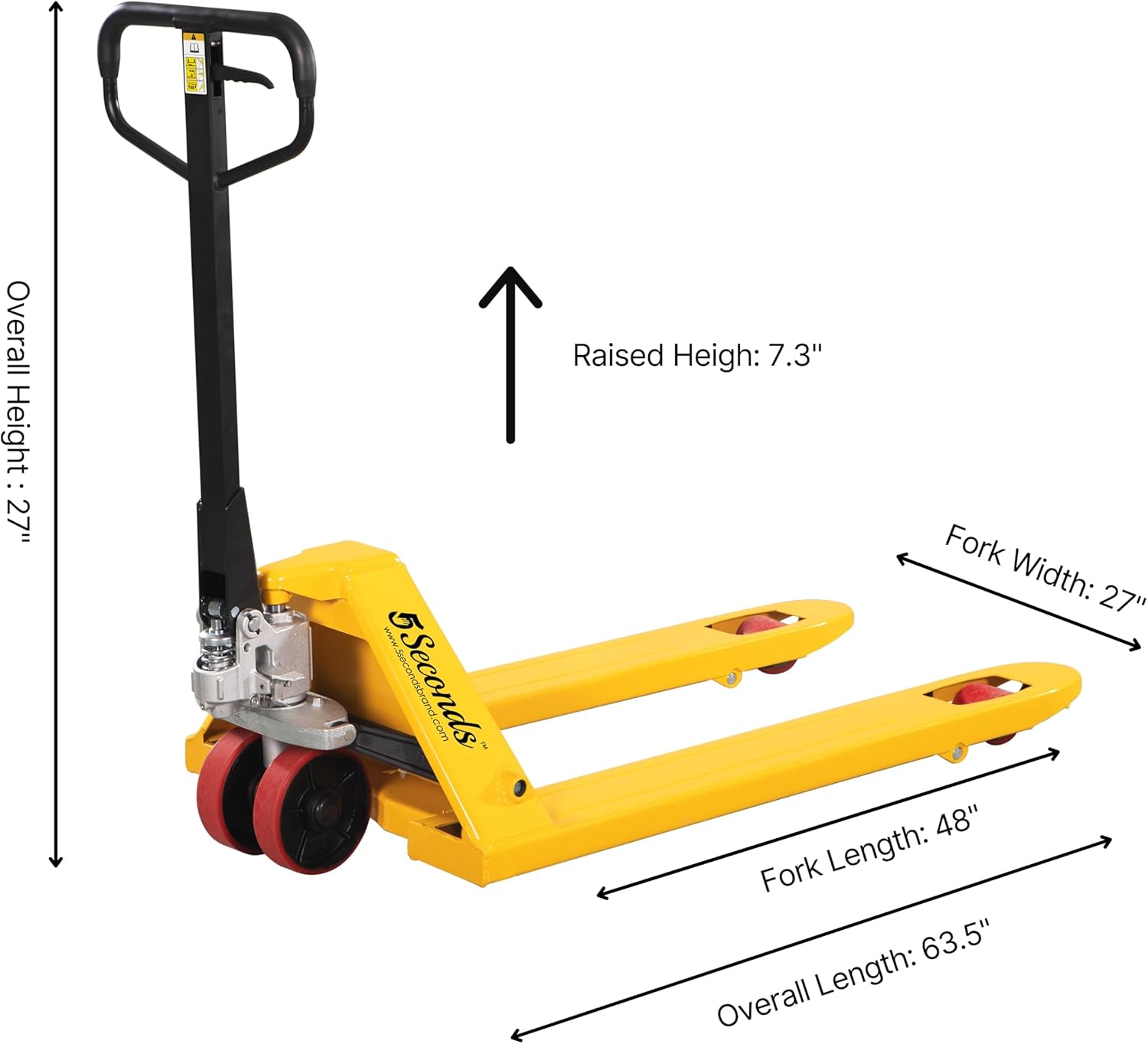 - 27" x 48" Forks for Standard Pallets: Designed for compatibility with standard pallets, this manual pallet truck offers a 3" lowered and 7.6" raised height, 6.3" fork width, and 2.9" fork thickness for smooth entry, stability, and efficient material handling.