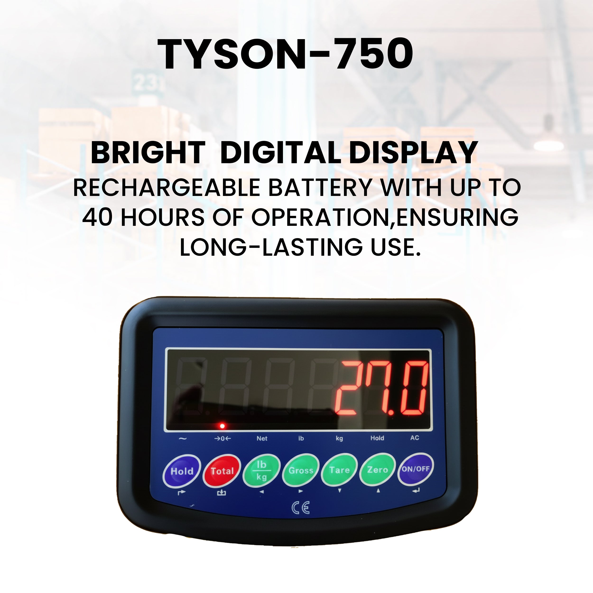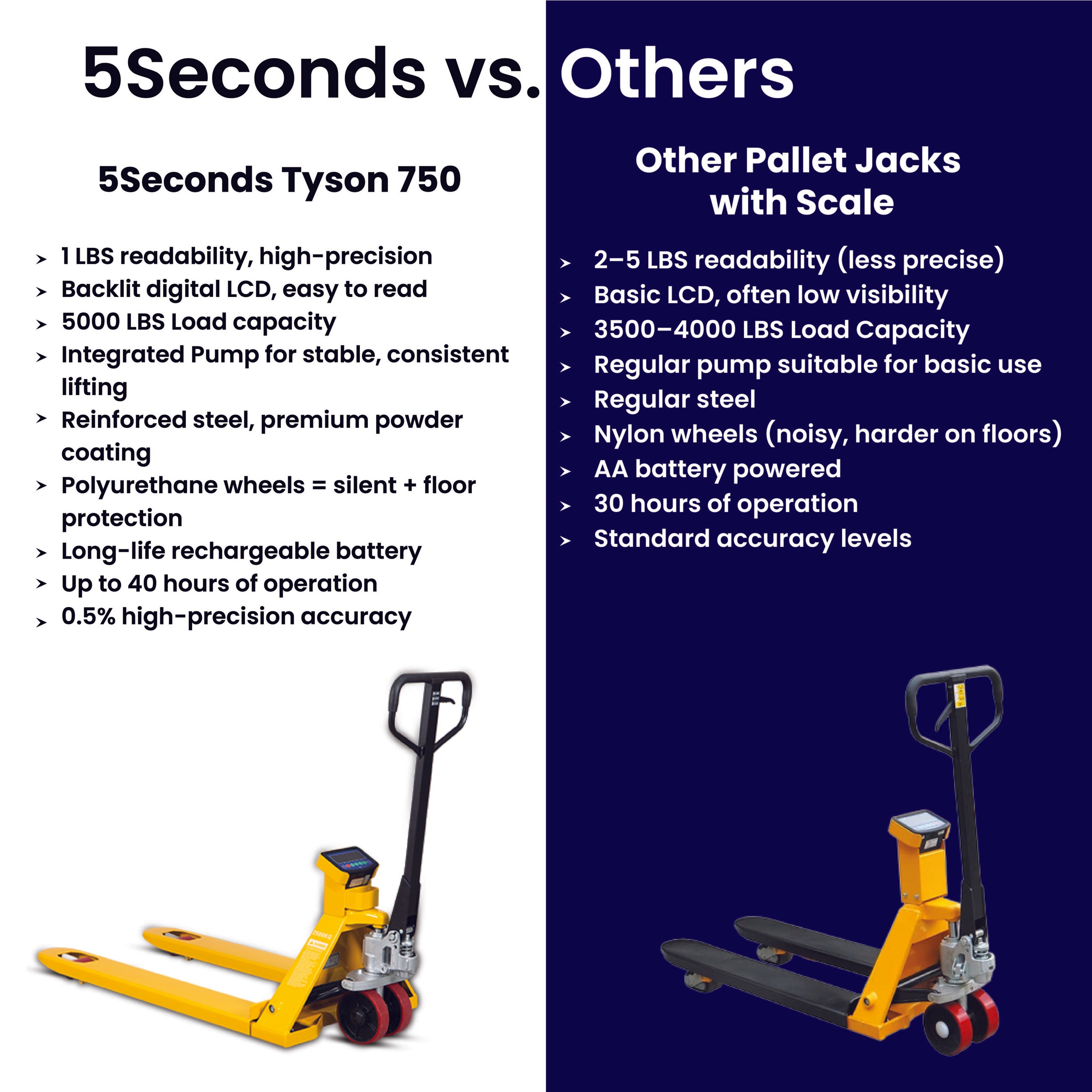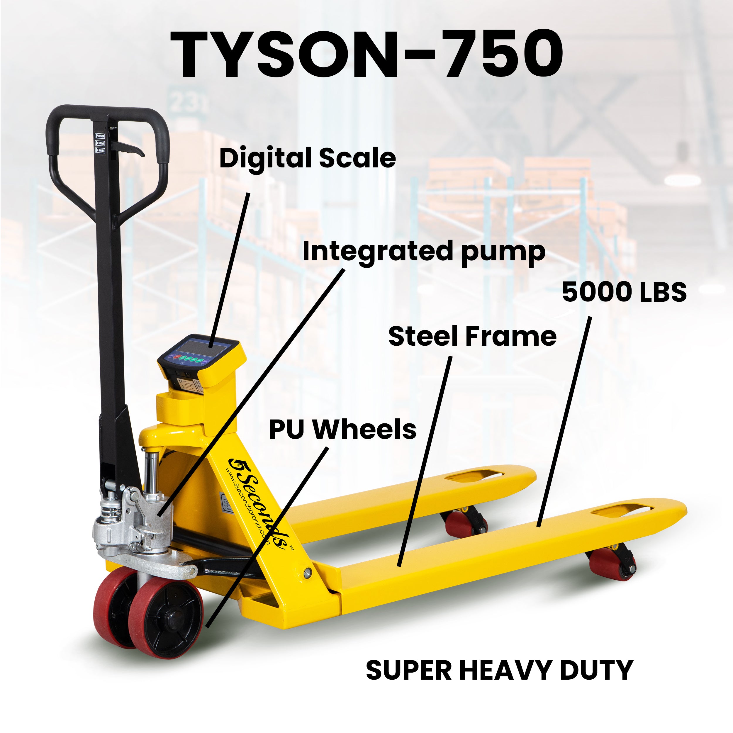 The 5Seconds Tyson-750 Pallet Jack with Built-In Scale is designed for accurate, efficient material handling in warehouses, shipping departments, and industrial environments. With a 5000 lb load capacity and 27” x 48” forks, this heavy-duty pallet jack handles standard pallets with ease.