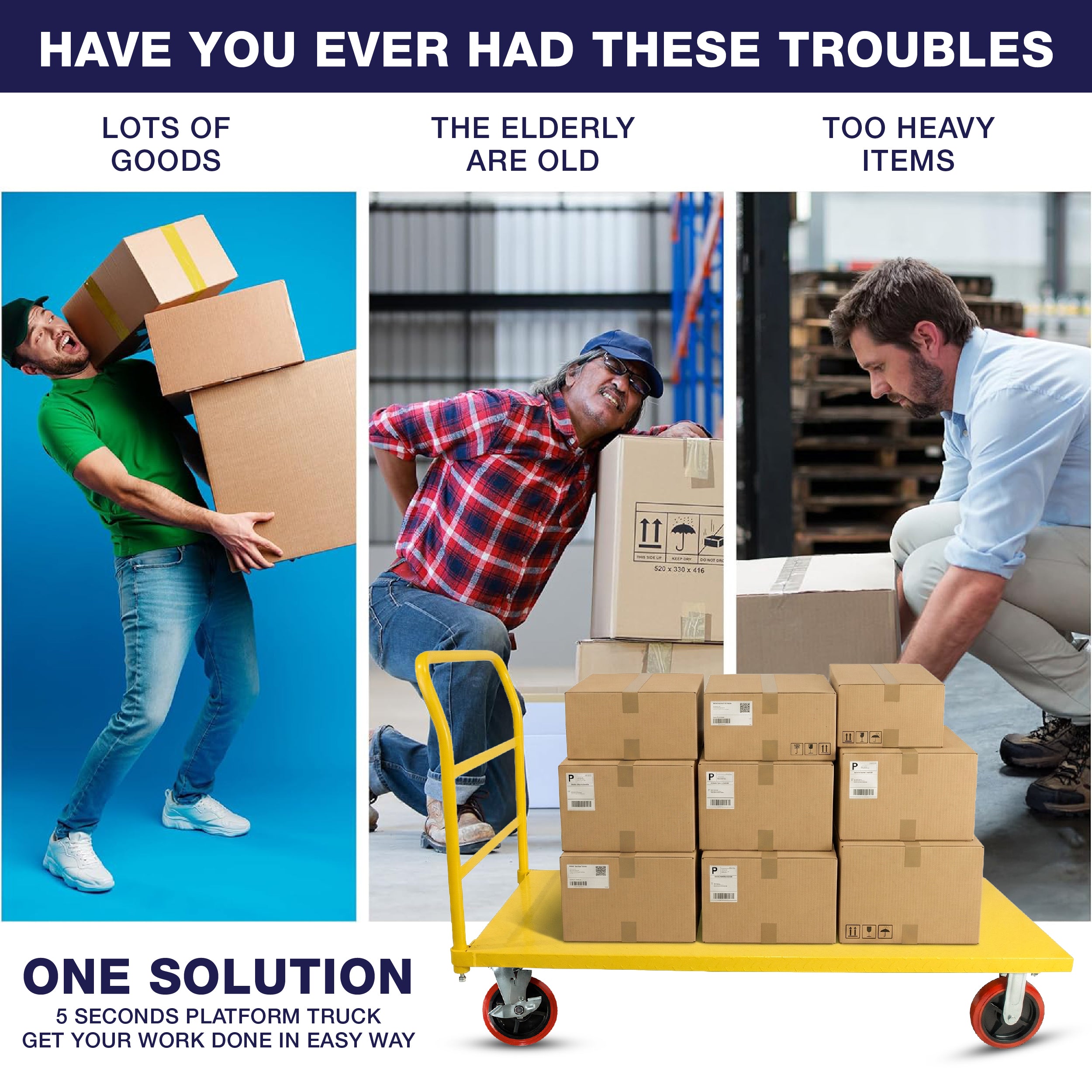 Heavy-Duty Platform Truck: This push dolly cart is designed to handle heavy loads with a maximum capacity of 3300 lbs., making it ideal for moving large and bulky items in warehouses, garages, retail stores, or industrial environments.