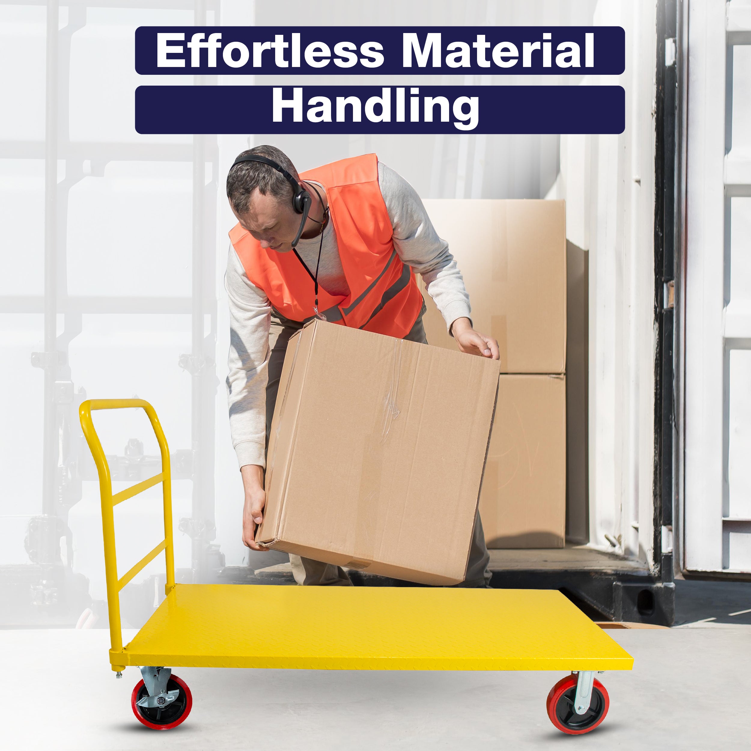 5Seconds Flatbed Platform Cart Industrial Dolly Cart Heavy Duty 60” x 30” Hand Truck Push Cart Super Heavy Duty Flatbed Cart Diamond Platted with 3300Lb Capacity 8'' Swivel Wheels Commercial Moving Cart. A steel platform truck is the ideal addition to any shipping or warehouse facility. The user might feel more secure because to the steel platform's construction. A smooth surface limits the amount of abrasion and scuffing that occurs during movement. While transporting items, the user may maintain an ergonomic stance thanks to the steel handle. Casters made of rubber and mold roll easily. Added robustness is provided by the powder coated finish. A platform truck with a steel tread plate is an improvement over the previous design. The user might feel more secure thanks to a tread plate design. The amount of jostling and movement by the products on the platform is restricted as a result of the increased texture. While transporting items, the user may maintain an ergonomic stance thanks to the steel handle. Casters made of rubber and mold roll easily. Added robustness is provided by the powder coated finish
